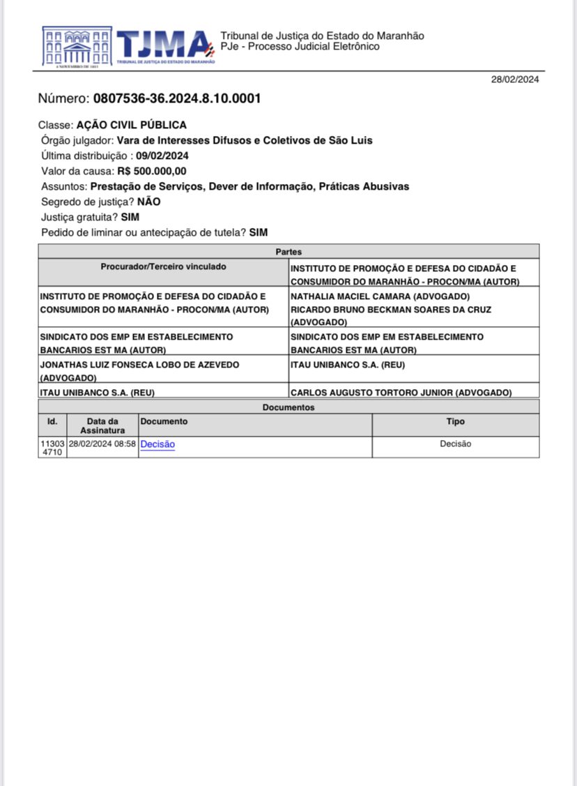O juíz da Barra de Interesses Difusos e Coletivos da Comarca de São Luís, Douglas de Meio Martins deferiu o pedido de tutela de urgência e determinou ao ITAÚ UNIBANCO S.A que se abstenha de fechar agências no Estado do Maranhão e mantenha o funcionamento pleno de todas as suas unidades e agências dos municípios do Maranhão até que seja apresentado um plano transparente de encerramento, que demonstre claramente como a demanda será absorvida sem causar prejuízos aos consumidores.