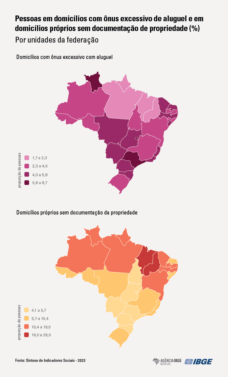 O estudo também analisou, nos domicílios próprios, se há documentação da propriedade. Em 2022, faltava documentação para 13,6% das pessoas que viviam em domicílios próprios, uma redução de 2,0 pontos percentuais em relação a 2019 (11,6%). “A inexistência de documentação indica que os moradores convivem com algum grau de vulnerabilidade e insegurança de posse”, explica Bruno Perez, analista da pesquisa.
